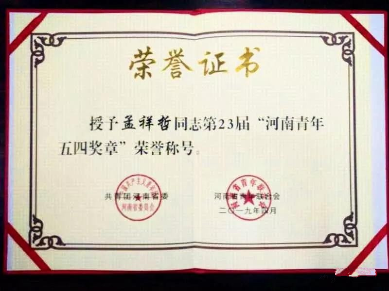 盟员孟祥哲荣获“河南青年五四奖章”殊荣